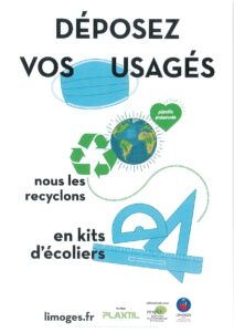 La ville de Limoges a mis en place une démarche participative et écologique pour collecter les masques et les recycler dans le but de les transformer en kits écolier pour les élèves des écoles primaires de Limoges.