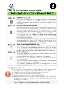 Le Point Info 5’ relaie chaque jour 3 ou 4 informations clés, en fonction de l’actualité, de l’évolution de la crise, des nouvelles consignes sanitaires ou d’organisation, des informations RH ou de santé et sécurité au travail. Il permet aussi de traiter les remontées de terrain sur les difficultés rencontrées et les questions posées par les agents grâce à un comité éditorial qui se réunit virtuellement chaque jour pour valider le numéro du lendemain. Ce comité réunit des membres du Service Technique de la Propreté de Paris (central et déconcentré), du Service de Prévention et des Conditions de Travail et du Service communication.