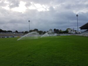 La maintenance d’un stade (arrosage, tonte) est grande consommatrice d’eau et l’arrosage qui doit s’adapter au plus près des besoins réels de la pelouse entraine de nombreux déplacements.